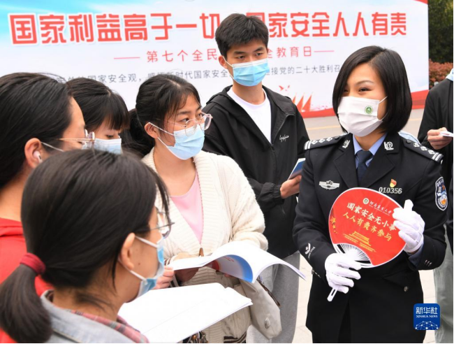 在河南农业大学开展“全民国家安全教育进校园”宣传教育活动中,郑州市公安局民警与学生们互动(2022年4月15日摄)。新华社发(刘书亭 摄)
