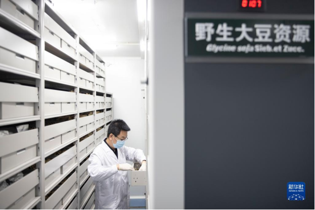 工作人员在黑龙江寒地作物种质资源库内查看野生大豆种质情况(2022年5月19日摄)。新华社记者 张涛 摄