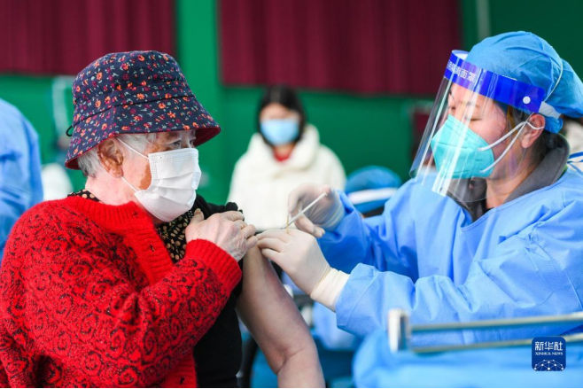 在内蒙古呼和浩特市公主府公园新冠疫苗接种点,一位老人在接种疫苗(2022年3月22日摄)。新华社记者 刘磊 摄