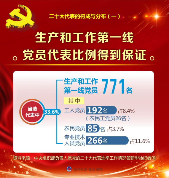 一是生产和工作第一线党员代表比例得到保证。当选代表中,生产和工作第一线党员771名,占33.6%。其中,工人党员192名(农民工党员26名),占8.4%;农民党员85名,占3.7%;专业技术人员党员266名,占11.6%。