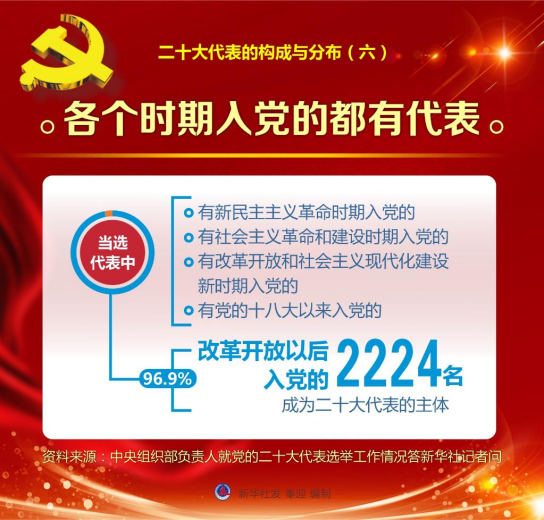 六是各个时期入党的都有代表。当选代表中,有新民主主义革命时期入党的,有社会主义革命和建设时期入党的,有改革开放和社会主义现代化建设新时期入党的,有党的十八大以来入党的。其中,改革开放以后入党的2224名,占96.9%,成为二十大代表的主体。