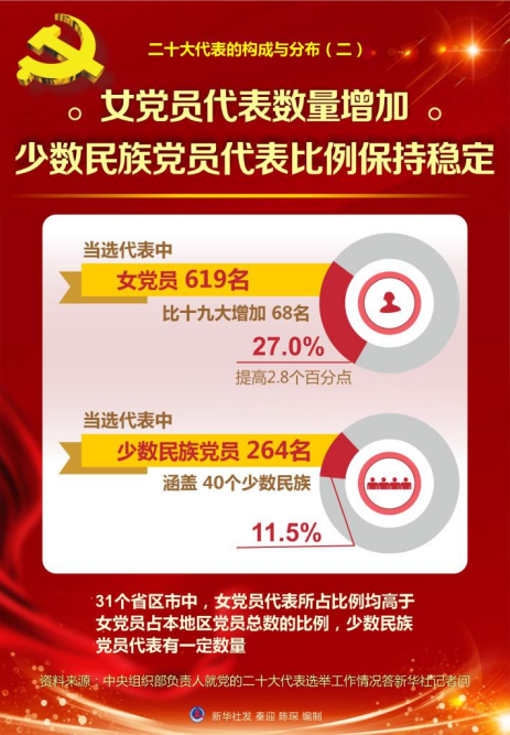 二是女党员代表数量增加,少数民族党员代表比例保持稳定。当选代表中,女党员619名,比十九大增加68名,占27.0%,提高2.8个百分点;少数民族党员264名,占11.5%,涵盖40个少数民族。31个省区市中,女党员代表所占比例均高于女党员占本地区党员总数的比例,少数民族党员代表有一定数量。