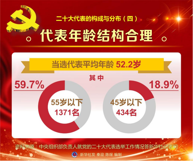 四是代表年龄结构合理。当选代表平均年龄52.2岁。其中,55岁以下的1371名,占59.7%;45岁以下的434名,占18.9%。