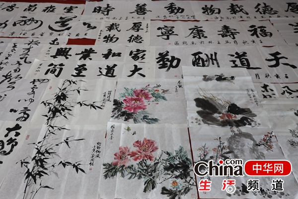 马春林创作的书法作品《厚德载物》《天道酬勤》《室雅兰香》《富寿康宁》等,雄浑大气、遒劲有力,贾普春创作的书法作品《春晓》《大鹏一日》等,行云流水、豪迈奔放,宋福明创作的书法作品《家和业兴》《大道至简》等,圆润饱满、端庄秀丽;林焕亭创作了墨梅、红梅、荷花等幅国画作品,笔酣墨饱、气韵生动,徐志玉创作的花鸟小品《牡丹》色彩艳丽、摇曳多姿,刘同起以画竹见长,墨竹图错落有致、浓淡相宜,清雅脱俗,风骨凛然。