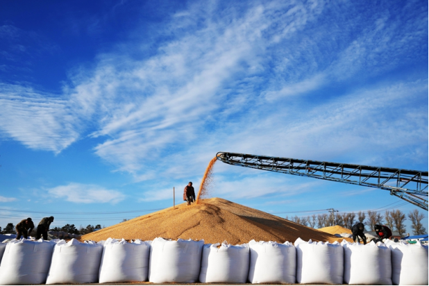 10月19日,在北大荒农垦集团有限公司北安分公司赵光农场有限公司,工作人员在一处晒场的玉米堆上忙碌。新华社记者 王建威 摄