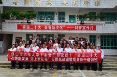 保山市老年大学(老干部党校)举办的“喜迎党的二十大,点赞新发展,迈上新征程”专题思政课暨党员骨干培训班,对全体干部职工和教师学员中的党员骨干进行思政课集中学习培训。培训班注重提高学员的政治规矩和政治意识,将党的二十大开幕盛况、《习近平谈治国理政》第四卷理论专题辅导、杨善洲精神教育、以学促思交流会融入思政课,让思政课教学实践特色鲜明、亮点突显,提高了思政课教学质量,为今后的老年教育思政课提供了可借鉴可推广的教学经验和模式。
