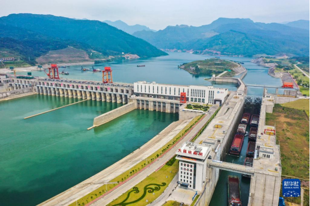 建设中的广西大藤峡水利枢纽工程和已经投入使用的船闸(2022年9月29日摄,无人机照片)。新华社记者 曹祎铭 摄