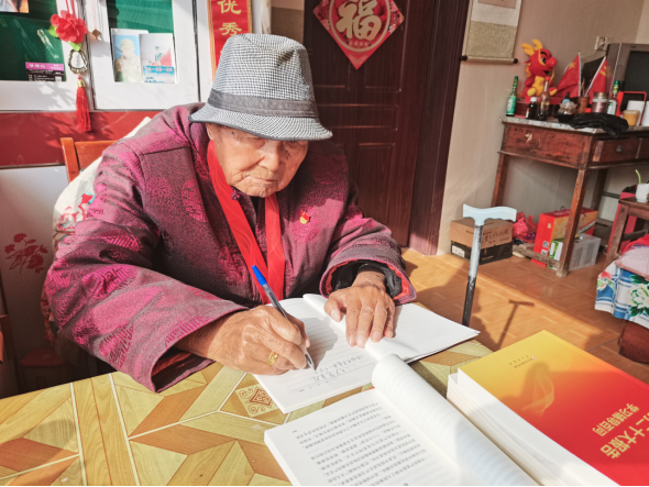 在郑本贵老人家里,随处可见摞得整整齐齐的书籍报纸,“我是一名党员,不能放松学习,要活到老、学到老。”老人有一个柜子专门用来放学习笔记,翻开笔记,每一本上都有不同的记录,有抄写的党章党规、有学习感悟、有随笔小诗,有的本子页面已经泛黄破损。近几年,老人又爱上了练书法,但他的书法内容与别人不同,主要是抄写党史国史、党章党规,并将抄写的免费赠送给青少年,在青少年心中播撒爱党爱国的种子。