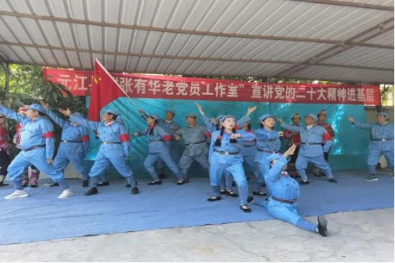 元江县张有华老党员工作室充分发挥“文艺轻骑兵”的作用,将党的二十大精神等内容融入花灯说唱中,创作出《党的二十大光芒照边疆》《十谢共产党》《北京传来好消息》等自编的花灯曲目,用“小节目”讲“大道理”,把优秀的文艺作品送到群众家门口,将党的政策宣传到百姓心坎里。玉溪各级老干部文艺团体、老年大学纷纷采取红歌联唱、文艺演出等方式引导干部群众听党话、感党恩、跟党走。