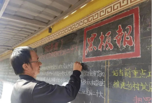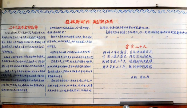 在峨山县双江街道登云社区小龙潭组,66岁的退休教师李志明将党的二十大报告里面的部分内容和关键词制作成最新一期黑板报,及时将党的二十大精神传递到群众当中。丰富的内容加上他一手漂亮的粉笔字,赢得了附近居民的喜爱和称赞。在市老干部活动中心,乒乓球室和台球室的黑板报前,老同志频频驻足朗读党的二十大报告金句。“来参加活动的都是老年人,看报纸费眼,我把金句抄写到黑板上,不但第一时间学习了大会精神,也方便大家观看。”正在编辑黑板报老同志薛成宗说。