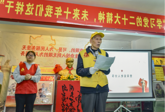 “伟大事业孕育伟大精神,伟大精神推进伟大事业。人民利益至上,全力以赴抗击疫情;精准扶贫不放松,共同富裕一个都不落;‘一带一路’促发展,推动实现共赢共享;共护绿水青山,建设生态文明,让人民同享幸福家园……这一切都让我感觉活在幸福之中。”党的二十大召开以来,已85岁高龄的曹老立即收集各类学习资料,充分发挥雷锋馆“省国防教育基地”的红色资源优势,利用“雷锋讲堂”宣讲党的二十大精神,为了更广泛的宣传学习党的二十大精神,他倡议举办了这场读诵会。“邀请大学生、消防人员、公交司机、志愿者一起用读诵的方式,通过原原本本的学习,让大家对党的二十大精神理解得更细致深刻。”