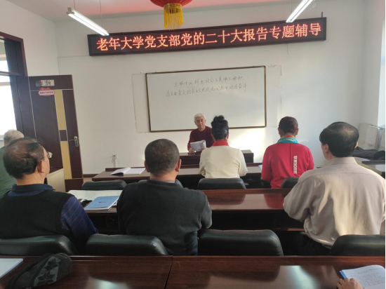 支部书记讲解一次专题党课。各离退休干部党支部将党的二十大精神作为“三会一课”的重要学习内容,各离退休干部党支部书记带头学习。老年大学、交通运输局等离退休干部党支部纷纷开展了关于党的建设方面的专题党课,党课从小切口看大格局,有力提升了离退休干部对党的二十大精神的学习感悟。