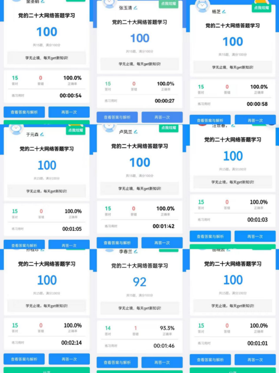 参与一次网络答题学习。为进一步加强对党的二十大精神学习,本次网络答题利用答题小程序,科学设置有关党的二十大报告的题目十五道,答题中设有计时,反作弊项目,进入答题页面需要注明姓名、单位,答题分数公开透明。有效增强了离退休干部对党的二十大精神的学习效果。