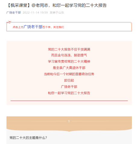在“广饶老干部”微信公众号“枫采课堂”板块开展“知识答题”活动,每期10道题,涵盖党的二十大报告的重大意义、丰富内涵、核心要义和实践要求等内容。同时,通过微信群及时推送“离退休干部工作”“山东老干部”“东营老干部之家”的学习资料,让老干部足不出户以自学的形式进行“掌上学习”,进一步加深老干部对党的二十大精神实质深层次的理解认识。