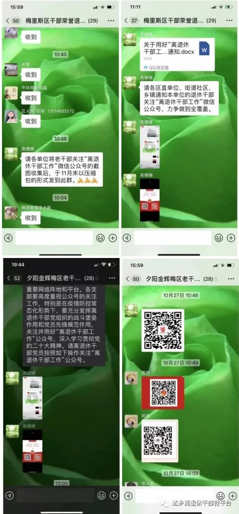 针对异地老干部和身体原因不能参加各类活动的老干部,通过“夕阳金辉离退休干部党支部微信群”“老干部社团微信群”等各种涉老微信群,“达乡离退休干部微信公众号”等载体平台,上传微信二维码截图,同时,为更直观了解二维码操作过程,为老干部做好关注技术上的指导服务,我们精心制作了“教学小视频”并发布到微信群,对关注步骤进行详细讲解,帮助老干部解决关注上的操作问题,提升关注率,扩大关注面。我们还通过打电话方式,逐一通知尚未关注公众号的老干部,确保老干部“应关注尽关注”。