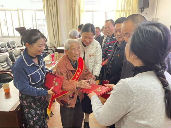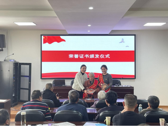 走进好榜样,致敬感恩岁月里的忠孝之情。仪式上,副所长朱顺龙宣读了市委老干部局下发的表扬通报。所长顾文琼为离退休人员党支部荣获“健康之星”的韩帼雄前辈和“公益之星”陈叶披上绶带、颁发荣誉盘和荣誉证书。作为干休所42年来工作的见证者、亲历者,住所离休干部韩帼雄和聂淑芬为“从事老干部工作20年”的同志颁发荣誉证书。大家品悟榜样事迹,感怀与可亲可敬的老干部心连心、爱同行的温馨岁月。96岁的“健康之星”韩帼雄信念坚定、学而不辍,是心态阳光、乐于奉献银发先锋;“公益之星”陈叶先后近百次到老年公寓、儿童福利院、戒毒所等地作义务心理咨询、帮扶孤寡老人、矫正儿童心理,先后资助2名大学生完成学业;杨茂顺、朱家全、朱德荣、李文顺等老一辈干休所人,从一砖一瓦建盖干休所,一草一木打造舒心休养环境,一点一滴倾注服务老干部的“儿女之情”;刘勇、杨建明、杜继玲、王新民、杨燕、倪盛伟等后辈继承优良所风,在老干部红色精神的滋养下积极努力辛勤工作,以“绿叶对根的情意”演绎着敬老爱老的动人故事;“最美老干工作者”王海月,二十载寒来暑往坚守在医务一线护佑夕阳红,老同志们亲切地称她为“好闺女”。