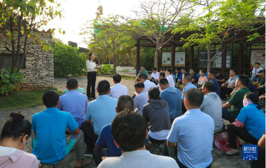 11月17日,党的二十大代表、海南陵水黎族自治县文罗镇副镇长、五星村党总支书记黄丽萍在三沙市赵述岛宣讲党的二十大精神。新华社发(吴亚铁 摄)