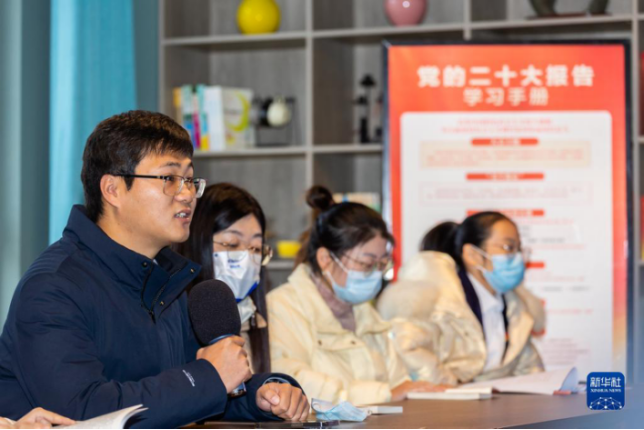 12月4日,江苏省南京市六合区农民画美术馆内,一场以江苏省非物质文化遗产六合农民画为载体的党的二十大精神宣讲会举行。这是冶山街道双墩村党总支书记耿云松(左一)在发言。新华社发(张梦 摄)
