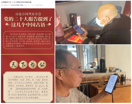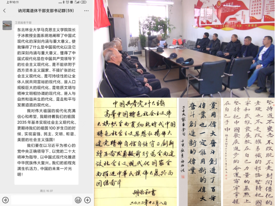 精心组织,突出学习宣传时效热度。根据离退休干部党员实际情况,采取“线上+线下”“集中+自学”“送学+宣讲”等形式,汇编学习资料,利用展板、微信群、公众号等多种载体,推送党的二十大报告“图解”“金句”等学习资料,推动学习持续升温。
