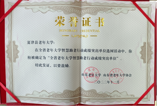 德州夏津县老年大学荣获“全省老年大学智慧助老行动成绩突出单位” 2022-12-14 10:10 作者: 顾文贻 编辑:家网编辑高姗姗 近日,在山东老年大学、山东省老年大学协会举办的全省老年大学智慧助老行动成绩突出单位选树活动中,德州夏津县老年大学被确定为“全省老年大学智慧助老行动成绩突出单位”。夏津县老年大学认真贯彻落实中央、省、市工作部署和《山东省老年教育条例》要求,积极发挥“智慧助老”引领作用,通过硬件适老化、教学智能化、服务助老化建设,推进“适老化”服务,乐享“智能化” 生活,营造了尊老敬老助老的良好氛围,提升了广大老年人的获得感、幸福感和安全感。夏津县老年大学将珍惜荣誉,再接再厉,持续深入开展智能技术教育培训,广泛开展智能技术帮扶活动,积极开展家庭成员孝心助老活动,帮助更多的老年人跨越“数字鸿沟”,共享智慧生活,为建设新时代社会主义现代化新夏津贡献力量。 查看所有评论