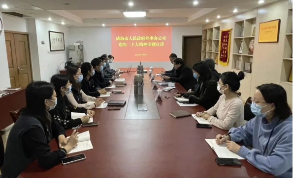 近日,威海市外办举行党的二十大精神专题宣讲报告会,会议邀请党的二十大代表、市公安局反恐怖支队支队长陈强作专题宣讲,市外办全体党员干部、退休干部党支部代表参加。