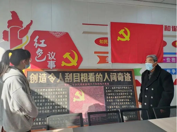 “参加这次‘双百结对联动’专题宣讲活动,让我有了不少新感悟,所以回来我就绘制了新的板报”,在辛店街道雅苑社区金章工作室里,老党员苏金章站在“献礼党的二十大 奋进新征程”为主题的板报旁,为居民讲解道。惟妙惟肖的花鸟鱼虫,深刻有力的笔锋,让许多居民驻足站在黑板前,细细品读,流连忘返。