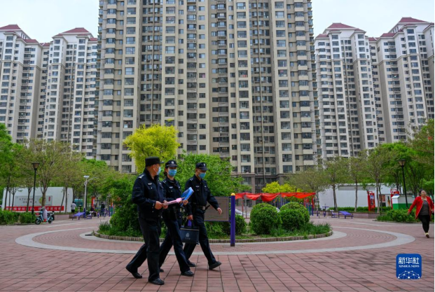 天津市公安局津南分局中铁派出所的社区民警吕诗情(中)与民警王洪心(左)、辅警李兆辉在林景家园内巡逻(2022年4月28日摄)。新华社记者 孙凡越 摄