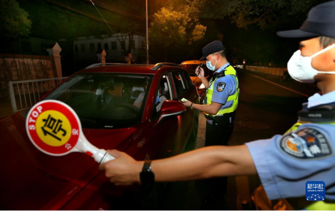 上海市公安局闵行分局梅陇派出所民警在夏夜治安巡查宣防集中统一行动中检查司机证件(2022年7月23日摄)。新华社记者 凡军 摄