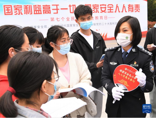 在河南农业大学开展的“全民国家安全教育进校园”宣传教育活动中,郑州市公安局民警与学生们互动(2022年4月15日摄)。新华社发(刘书亭 摄)
