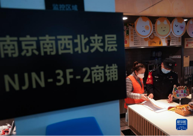 南京铁路公安处南京南站派出所民警和志愿者一起在南京南站一家商户检查防火巡查记录(2021年11月25日摄)。新华社记者 季春鹏 摄