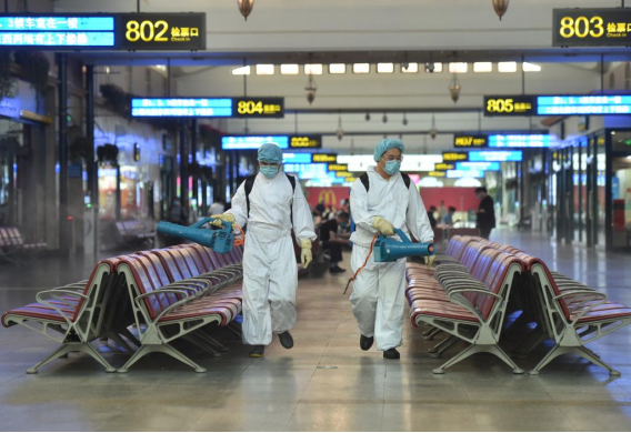 北京站工作人员在候车大厅进行消杀作业(2020年6月18日摄)。新华社记者 陈钟昊 摄