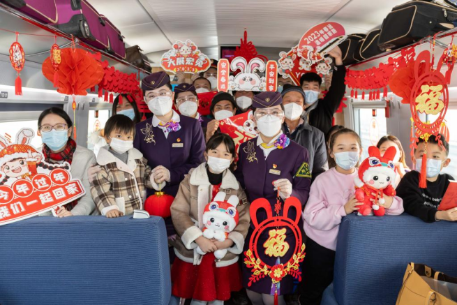 2023年1月7日春运启动。这是当日旅客和乘务员在G1373次列车上拿着新年装饰品合影留念。新华社记者 王翔 摄
