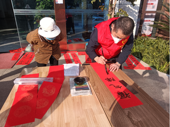 在活动现场,银发志愿者们挥毫泼墨,各显才能,楷书、行书、草书、隶书、篆书各种字体龙飞凤舞,不一会儿,一副副喜庆“福”字、春联就展现在人们眼前,春联上祝福的话语,给新的一年带去了欢乐、祥和,增添了浓浓的年味。一幅幅对祖国强盛和美好生活祝福的春联,一句句祝福与期盼,一个个苍劲又灵动的大字跃然纸上,一些刚刚写出的新联,墨迹还未干,便被群众领取,一副副春联为居民提前带来了节日的气氛,也让他们感受到了来自党和政府的关爱和祝福,受到党员群众的点赞。