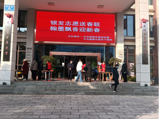 从1月12日以来,中共楚雄市委组织部、中共楚雄市委老干部局组织威楚银发志愿服务团书法家在市党群服务中心、市老年大学、学桥街社区、栗子园社区等地,为市民义务书写赠送春联和福字8场次2500多幅,为群众送去新春佳节的美好祝福。