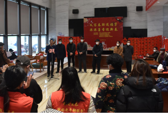 “春联是我们中国特有的一种文化形式,人们通过以对仗工整、简洁精巧的江西文字描绘美好形象,抒发美好愿望。贴春联、赏春联是中华民族传统的风俗习惯,写春联、送春联体现了离退休老干部亲民爱民的高尚美德……”为营造吉祥如意的春节气氛,弘扬向上向善的道德风尚,把社会主义核心价值观传播到基层,把吉祥祝福送到千家万户,由江西省上饶市委老干部局主办,由上饶市老年书画协会、上饶市老干部服务中心、信州区北门街道承办,以“义写春联送福字、浓浓墨香迎新春”为活动主题的进社区为群众送春联活动于1月11日上午在信州区北门街道郭门村委会隆重举行。