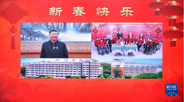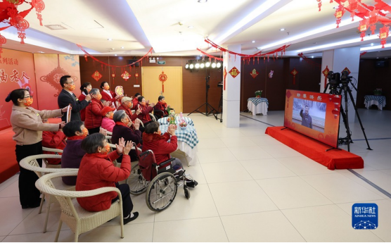 视频连线镜头切换到福建省福州市社会福利院,在院老人和护理人员纷纷向总书记问好,习近平给大家拜年。他仔细询问福利院生活和医疗条件、疫情防控和老年人疫苗接种情况,并同在院老人聊起身体状况、日常生活,嘱咐他们保重身体。当得知这里伙食品种丰富,药品储备充足,对有基础病的老人加强了日常健康监测,节前备足了年货,习近平十分高兴。老人们拿出亲手制作的剪纸“福”字,向总书记献上真诚的祝福,习近平表示感谢。他强调,当前,病毒仍在不断变异,这一波疫情虽然毒性有所减轻,但传播更快、传染性更强,对老年人风险很大,我特别关心关注老年朋友。老年人是当前疫情防控的重中之重,对养老院、福利院等机构人员防护和健康管理的措施,要严于其他场所,严防发生聚集性疫情。养老院、福利院等要加强与医疗机构的配合,推进疫苗接种,完善防控和救治机制,确保重症患者及时得到救治。习近平指出,尊老爱老是中华民族的优良传统和美德。一个社会幸福不幸福,很重要的是看老年人幸福不幸福。我国社会老龄化程度越来越高,一定要让老年人有一个幸福的晚年,要大力发展养老事业和养老产业,发展公办养老机构和普惠型养老服务,特别要强化对特困、低保、高龄、失能老年人的兜底保障。要适当组织开展文体活动,丰富老年人精神文化生活,让老年朋友过一个欢乐、健康、祥和的春节。