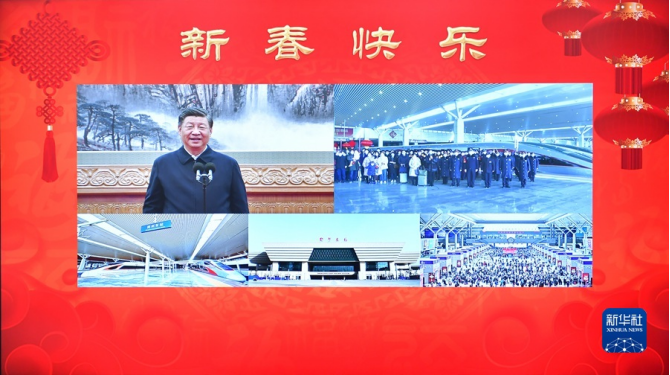 1月18日,中共中央总书记、国家主席、中央军委主席习近平在北京通过视频连线看望慰问基层干部群众,向全国各族人民致以新春的美好祝福。这是习近平通过视频连线,同郑州东站铁路客运干部职工和旅客亲切交流。新华社记者 李涛 摄