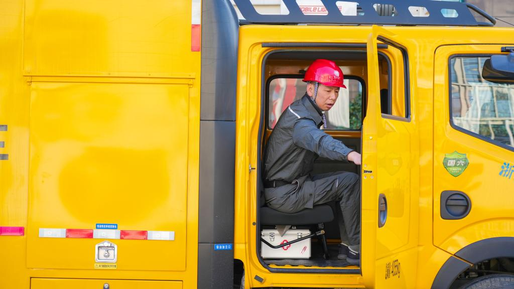 金渊乘坐作业车奔赴抢修现场。(受访者供图)
