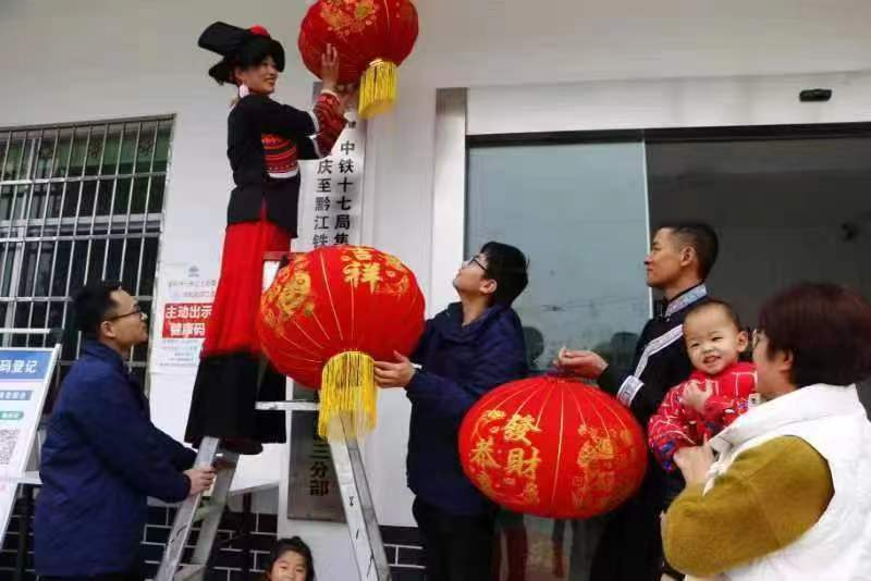 中铁十七局汉、彝职工共同悬挂新春灯笼。(受访者供图)