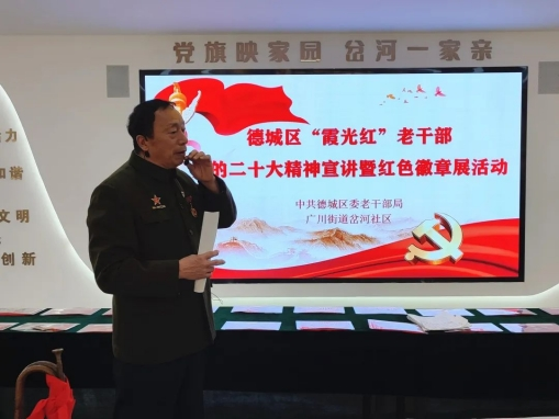 为宣传党的二十大精神,传承红色基因,赓续红色血脉,近日,德州市德城区委老干部局联合岔河社区,开展“霞光红”老干部党的二十大精神宣讲暨红色徽章展活动,省离退休干部党组织书记宣讲员、“德州‘五老’模范”陆卫兵主讲,吸引了退休干部党员、老干部志愿者、社区群众前来观展。