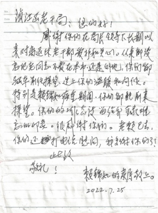 虽然信中话语不长,但足以表达离休干部家属与老干部工作者之间难忘的相处情谊。信里写的“不管在本市还是外地,都能驱车前往探望,送上温暖和问候”“你们的工作态度留给我全家难忘的印象”,对老干部工作给予了充分的肯定。