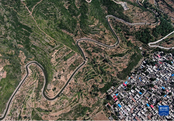 红旗渠总干渠从一座村庄旁绕过(2019年7月5日摄,无人机照片)。新华社记者 李安 摄
