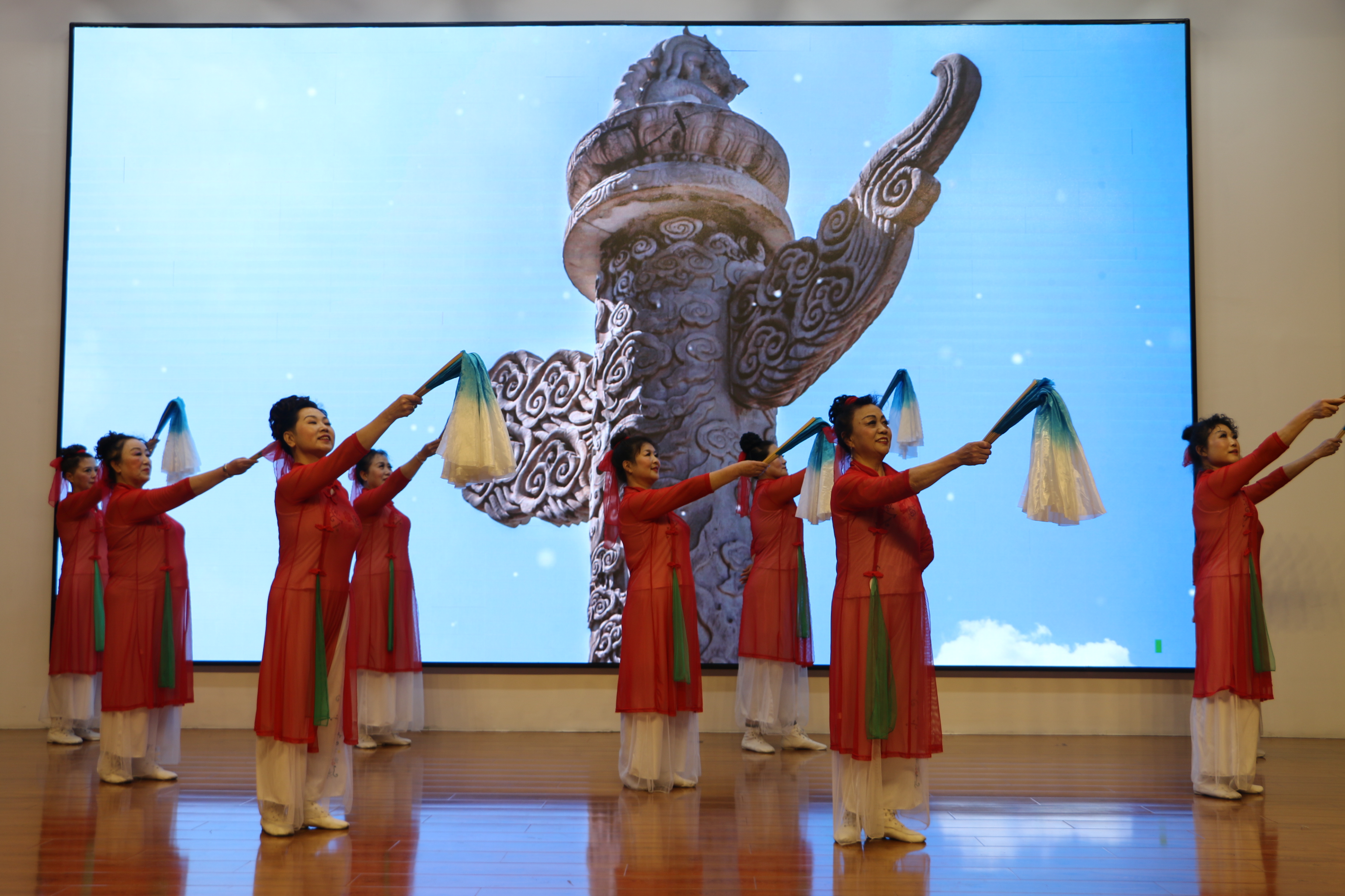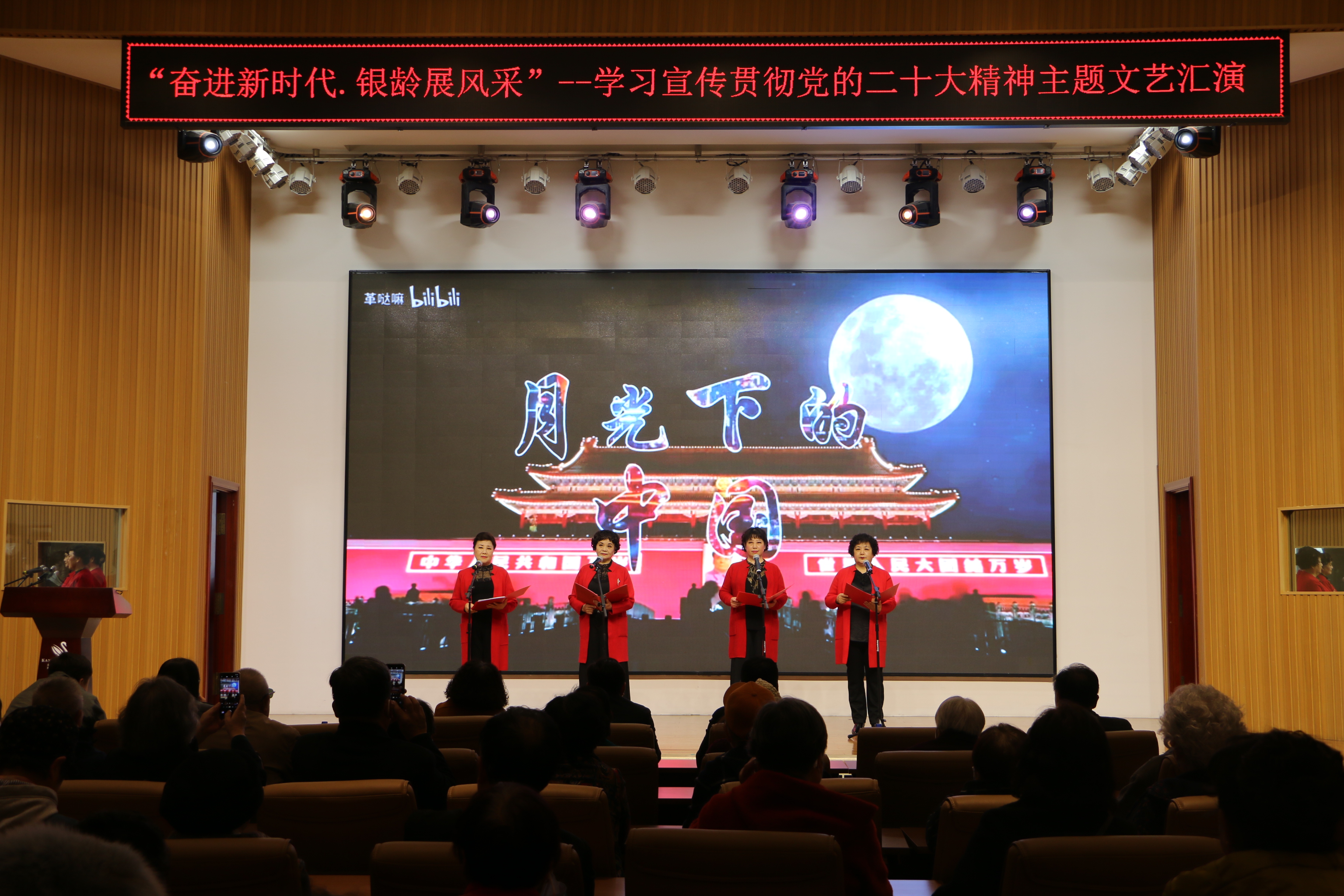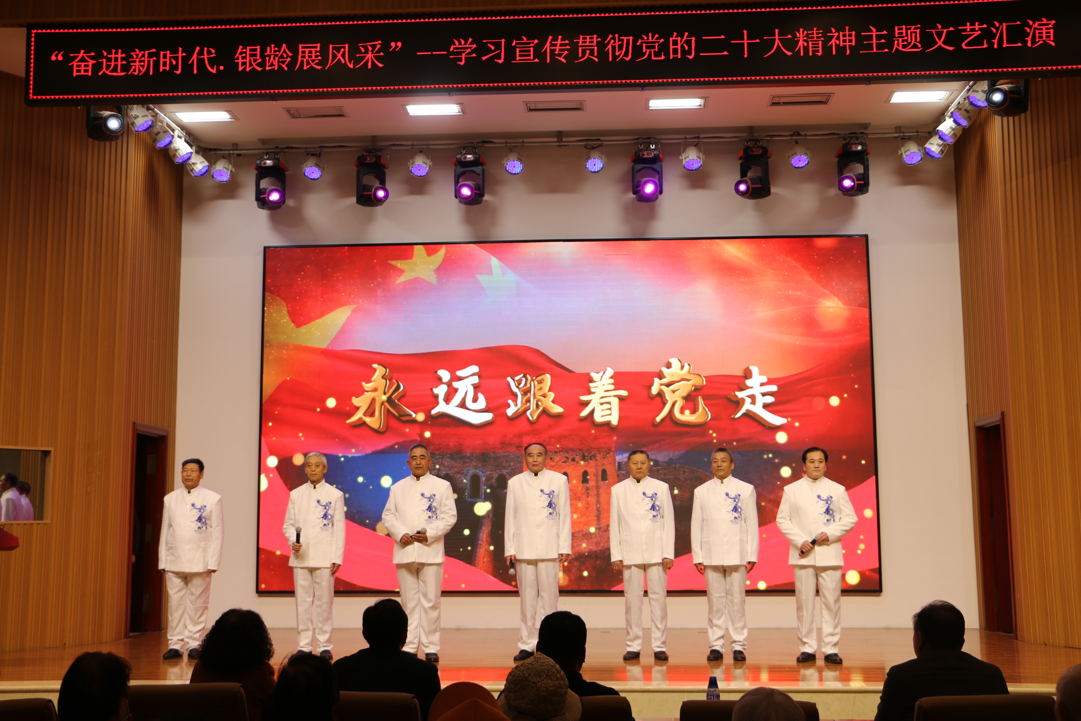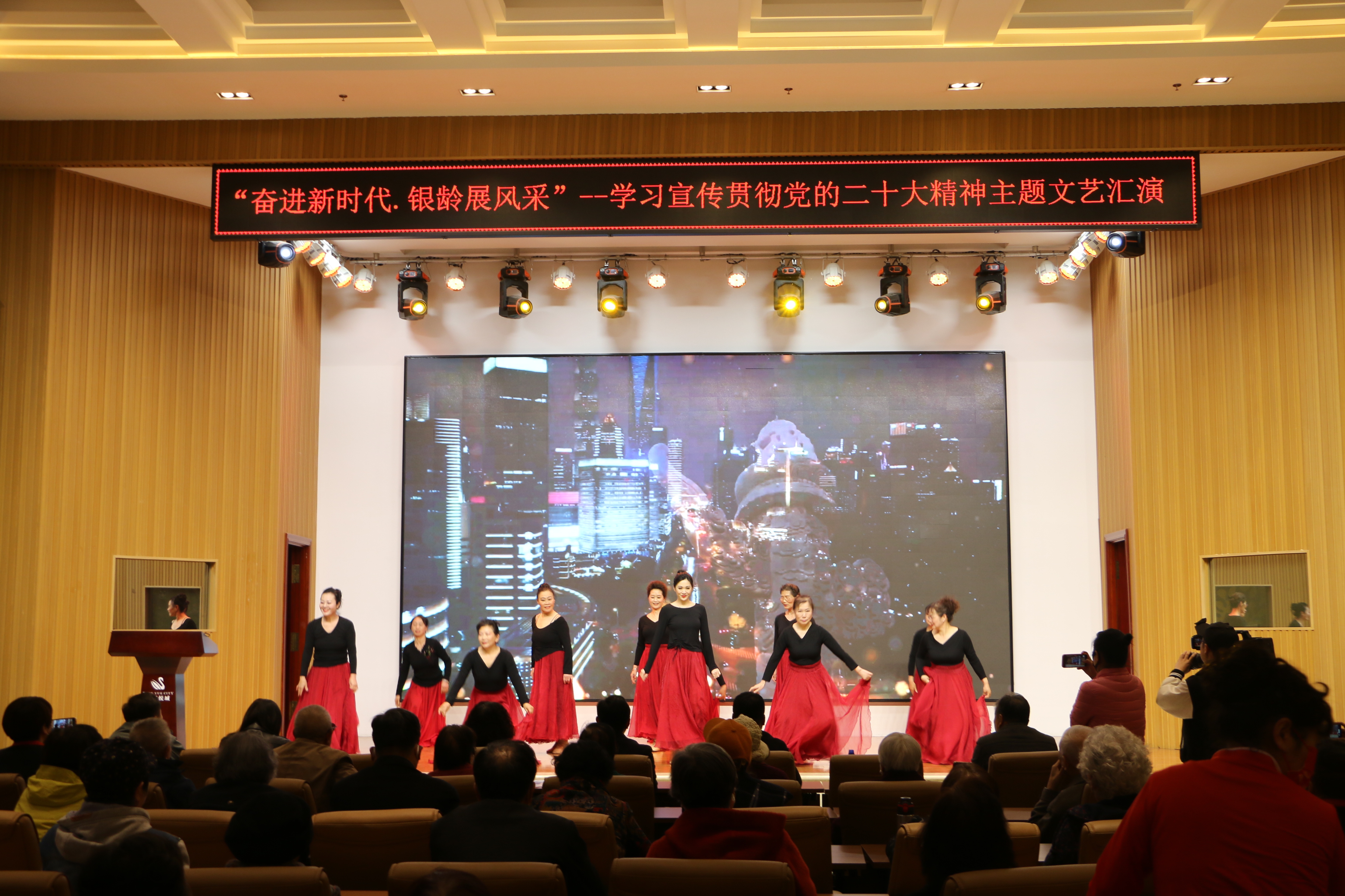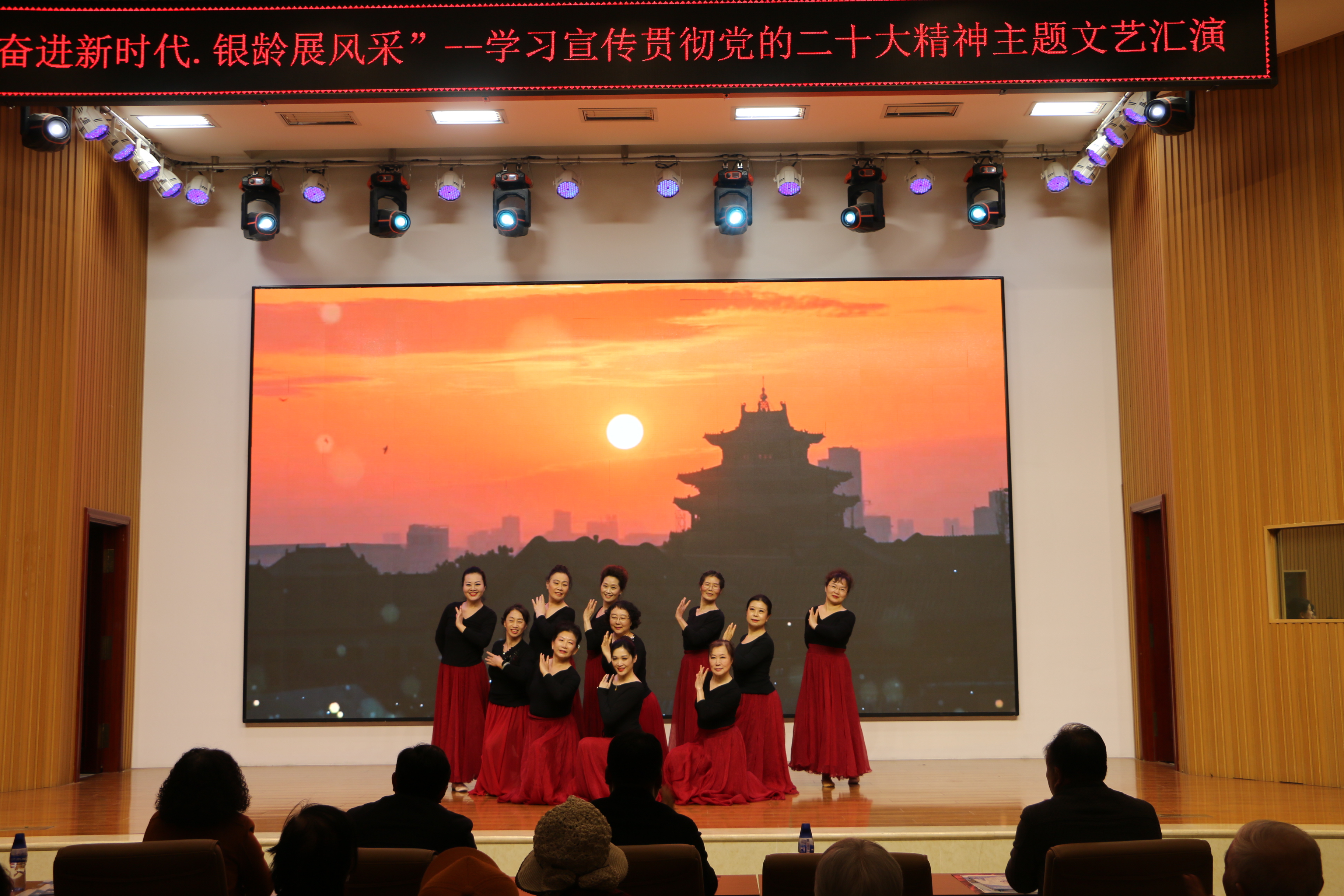 演出以激昂的器乐合奏《金蛇狂舞》开场,继而奉献了诗歌朗诵、民族舞蹈和男声小合唱《永远跟党走》、三句半《贯彻党的二十大奋进新征程》等,形式多样,精彩纷呈。舞台上,老干部铆足了劲,投入和释放了极大热情和感情。