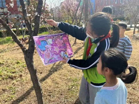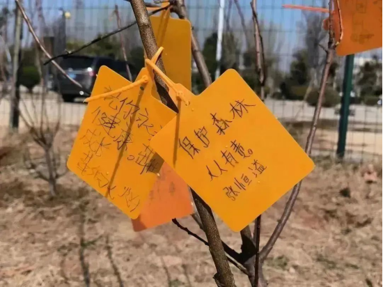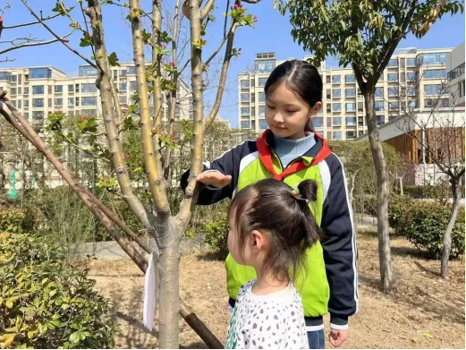 实验小学和幼儿园植绿护绿现场,幼儿园的孩子们也纷纷参与进来,通过量一量、抱一抱等方式来“相认”自己喜欢的树木,给小树浇水、施肥,并在少先队员们的帮助下制作认养标牌,悬挂认养标牌后,老师带领孩子们一起捡拾落叶、除草来养护绿化学校环境。