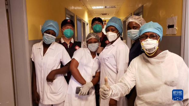 2020年5月26日,中国抗疫医疗专家组在刚果(布)首都布拉柴维尔指导新冠肺炎病房建设时,与当地一线医务人员合影。新华社发
