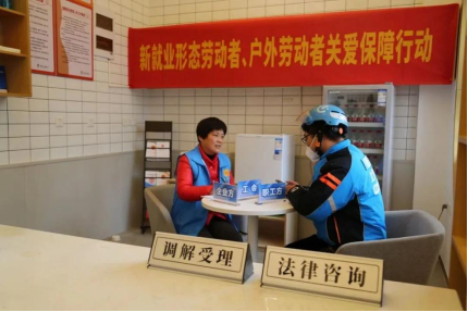 当天上午,揭牌仪式后,调解室工作人员还在现场开展了新就业形态劳动者、户外劳动者关爱保障行动。调解员牟婉芳现场受理职工法律咨询,并公布了预约电话,向新业态劳动者详细介绍了申请法律咨询与调解服务的流程与方法。