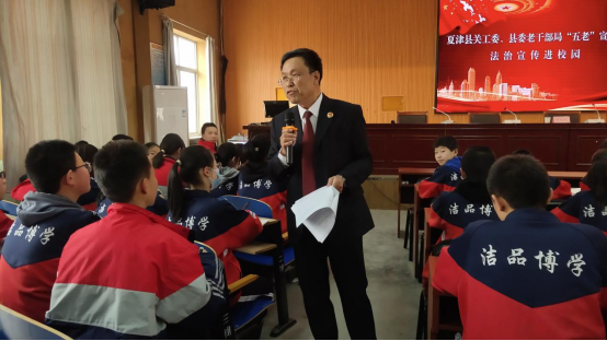 此次宣讲活动邀请到了县关工委“五老”宣讲团成员、县人民检察院检察官霍瑞珂,为孩子们做了主题为《预防青少年犯罪》的法治宣讲。“我是一名检察官,不忍心让任何一个孩子触法。”兼任多所学校法治副校长的“五老”人员霍瑞珂说,做未检工作多年来,他的情怀就是做青少年普法和心理健康教育,让孩子们都能走正道,健康成长。多年来,闲不下的霍瑞珂坚持在为青少年普法奔走,收集青少年违法犯罪案例、校园安全事故案例等100多件,深入学校、社区进行普法宣讲20余场。与此同时,在夏津县还有很多像霍瑞珂这样参加普法的“五老”奔走在“关爱明天、普法先行”的路上。
