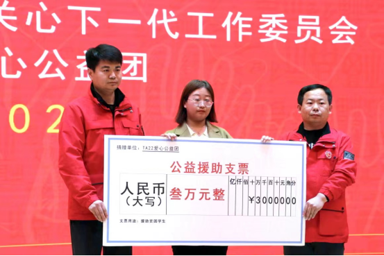活动中,TA22爱心公益团向学校捐赠助学金3万元,与会领导为30名受助学生赠送了书包、文具等学习用品。