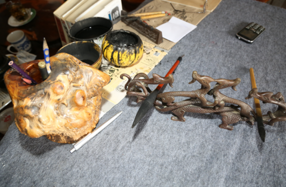 为了能静下心来完成创作,焦炳仁画画的时候就闭门谢客,电话也不接。他说:“必须集中精力一气呵成,画坏了整张都得扔掉重新再来。”创作期间,他经常会进入一种忘我的状态,倒的茶水忘记喝,饭也忘了吃,有时候为了完成一个阶段性的创作,长时间趴在画案上,会累得腰酸背痛。