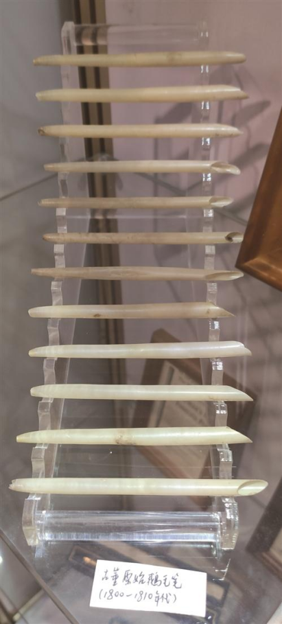 记者留意到一支造型十分奇特的鹅毛笔:笔体硕大,金属质地,外形就像一根巨大的鹅毛。蔡希说,这是英国皇室曾经用过的,手工雕刻的蘸水笔。“这种笔,由鹅毛制成,一只鹅摘取翅膀上五根鹅毛加工而成,那个时候英国的鹅毛笔都是加拿大鹅运到英国摘取鹅毛的。”